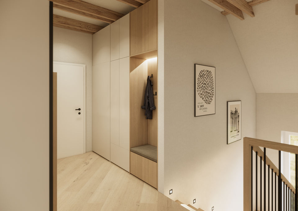 Aus dem einstigen Dachboden über der Garage entstand ein großzügiger, offener Wohnbereich, der mit sichtbaren Holzbalken ein warme und gemütliche Atmosphäre schafft.
